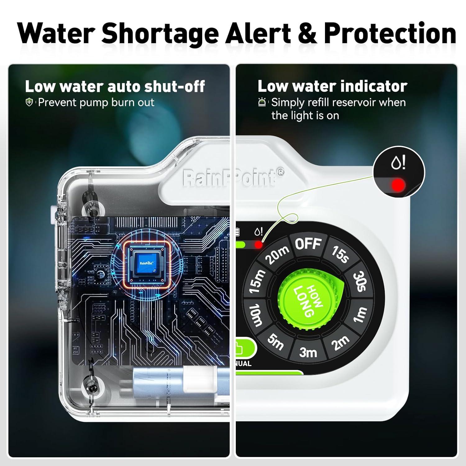 【🛡️Low Water Auto Shut-Off】 You don't have to constantly monitor the water source level. This pump timer is equipped with low water LED indicator and will automatically shut-off when the reservoir runs dry to prevent pump damage and plant dehydration. Anti-backflow valve is also integrated into the system to avoid water distribution deviation caused by siphon effect.