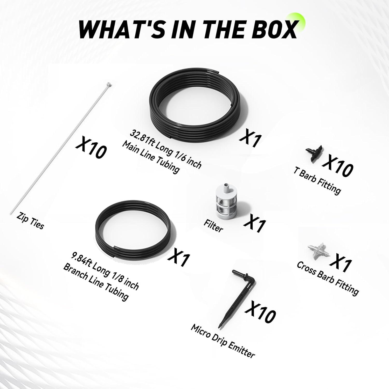 【What's In The Box】1* 32.81ft Long 1/6 inch Main Line Tubing, 1* 9.84ft Long 1/8 inch Branch Line Tubing, 1*Filter, 10* Micro Drip Emitters, 10*T Barb Fittings, 1*Cross Barb Fitting, 10* Zip Ties.