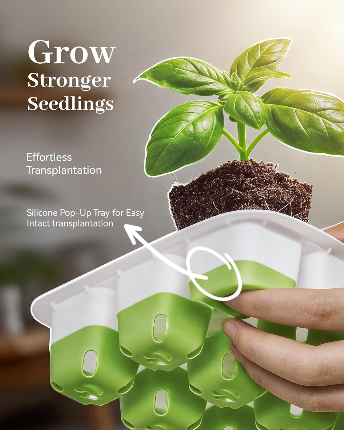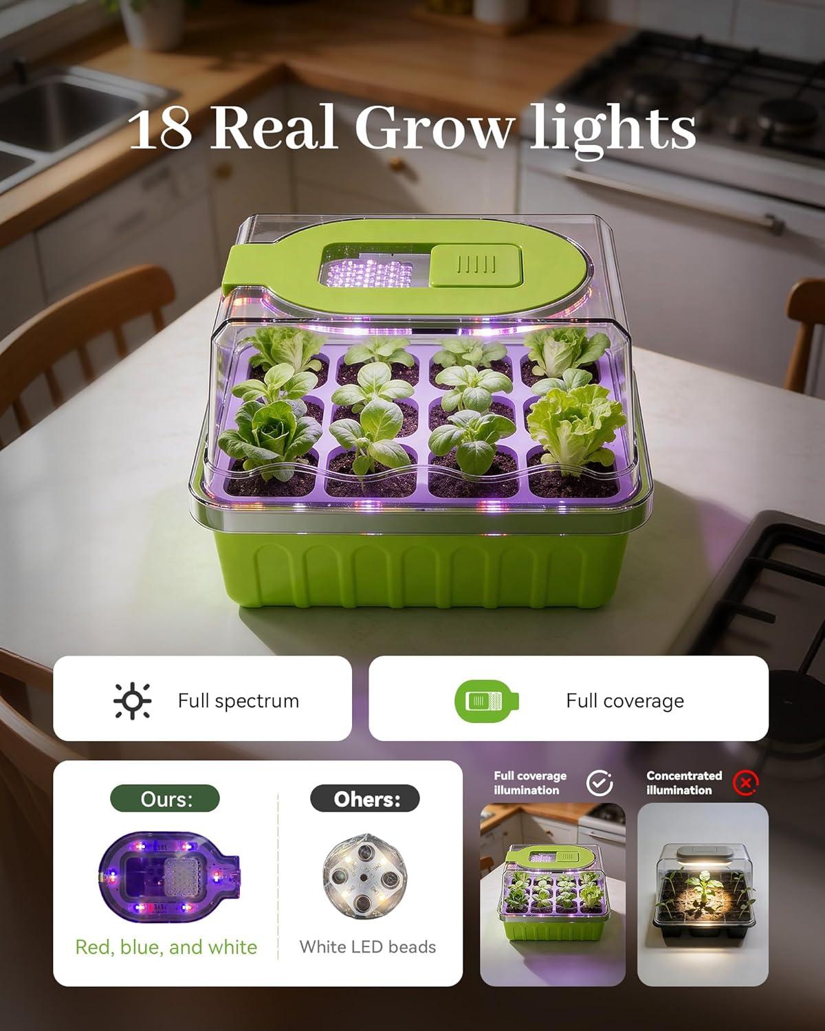 18 LED BEADS FOR FASTER SEEDLING GROWTH:Built-in 18 full-spectrum LEDs mimic natural sunlight with even layout,ensuring uniform light intensity for every seedling,speeding up development 1-2 times faster than pure natural light cultivation.