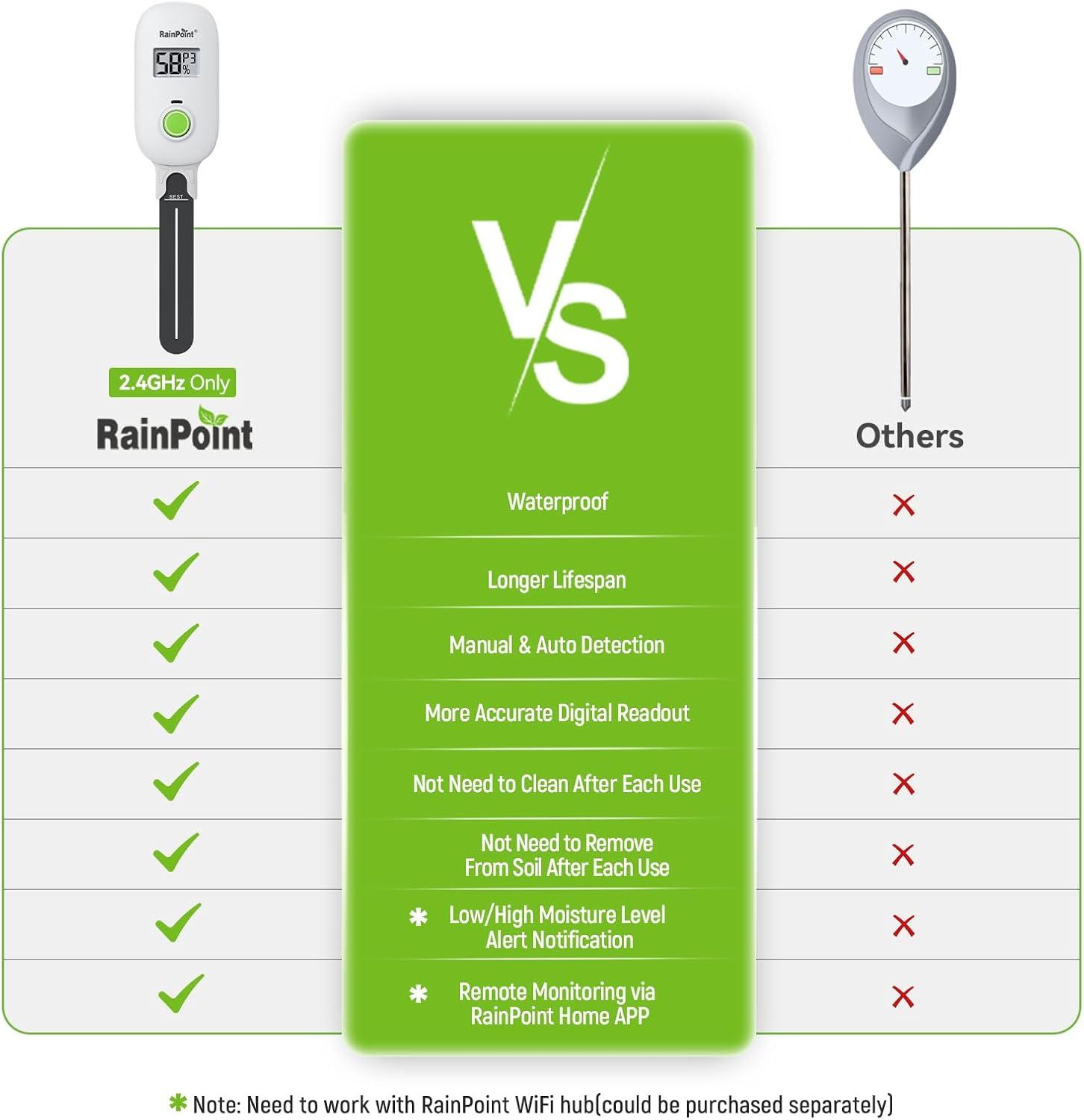 【🚀Capacitive Probe】Unlike traditional resistive probes which are prone to rust causing resuced accuracy, our RAINPOINT high-precision soil senor maps moisture with a long-lifespan capacitive probe. Easily know your pothos is thirsty before it droops, or your peppers need a drink without digging.